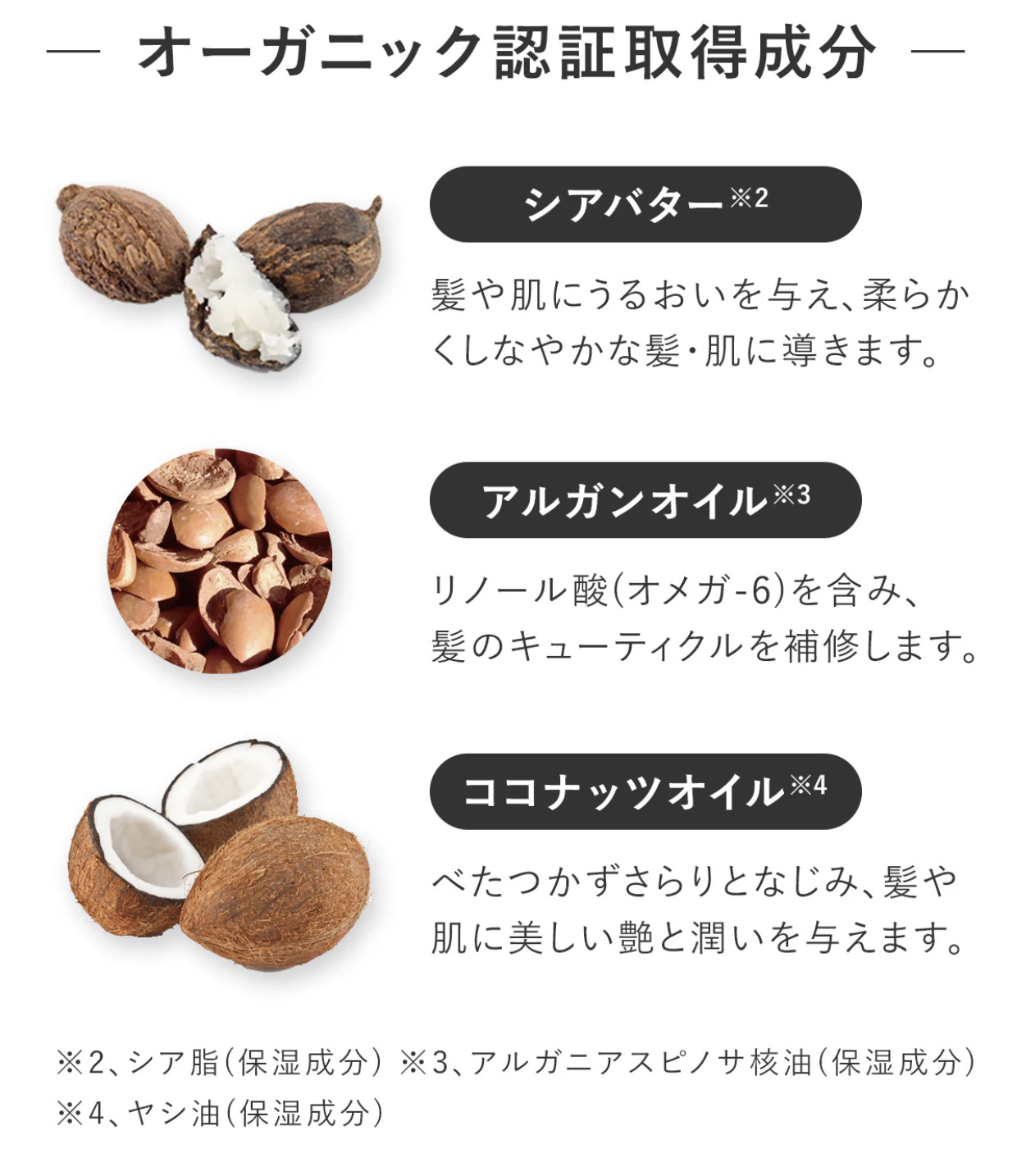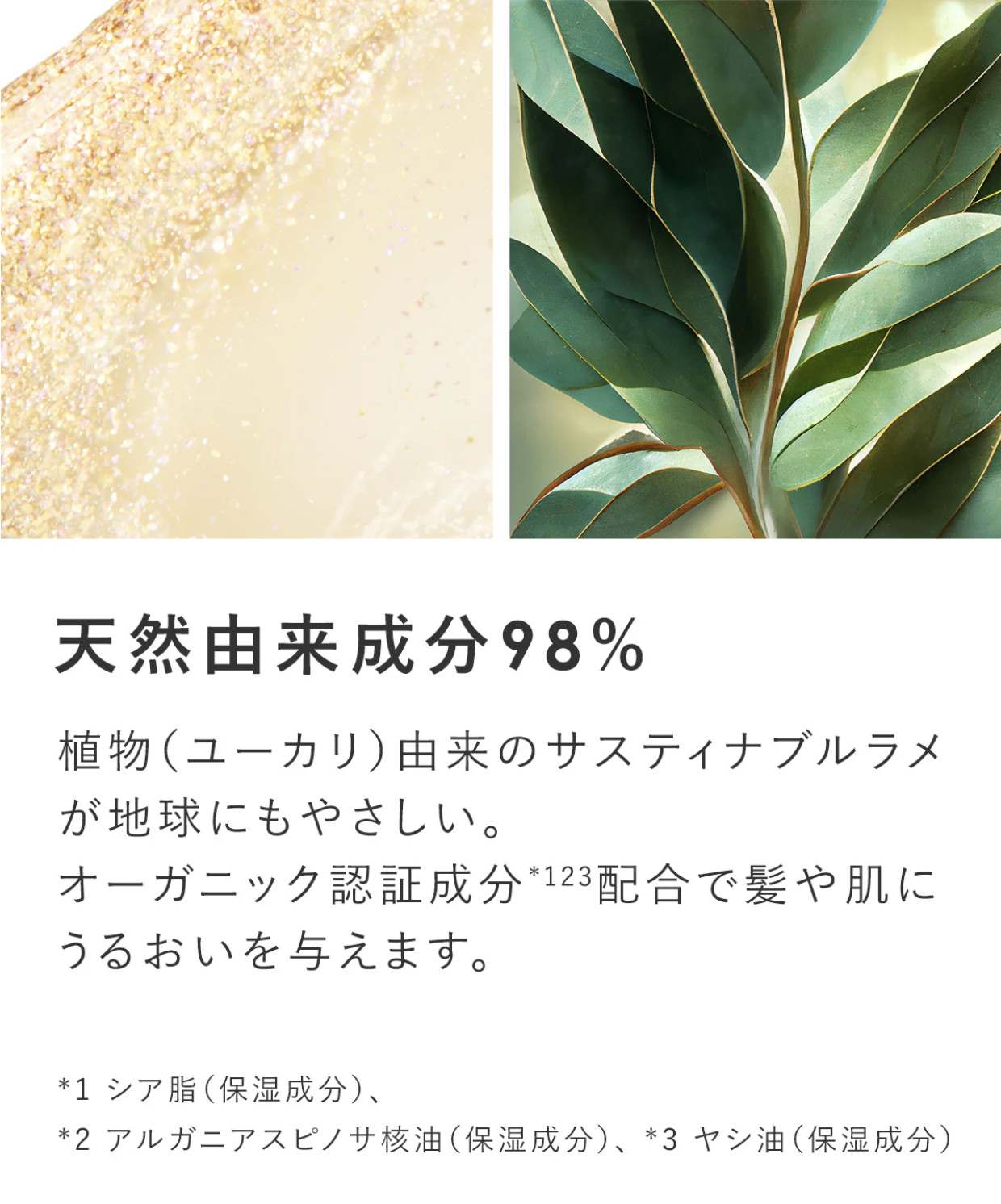 シアバター(シア脂)やココナッツオイル(ヤシ油)など、98%が天然由来の保湿成分で髪や肌に潤いを与え、自然に還る植物ユーカリ由来のサスティナブルラメが軽やかな艶をプラスします。