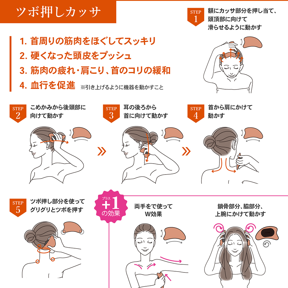 スカルプカッサブラシは、頭皮のコリをほぐす「ブラシ部分」、リンパを流す「カッサ部分」、首・肩のツボを刺激する「ツボ押し部分」があり、これひとつで首から上のトータルケアにお使いいただけます。