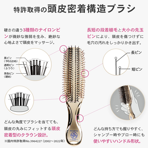 572個の先玉ピンと段差植毛、頭皮密着設計で毛穴の汚れを除去。