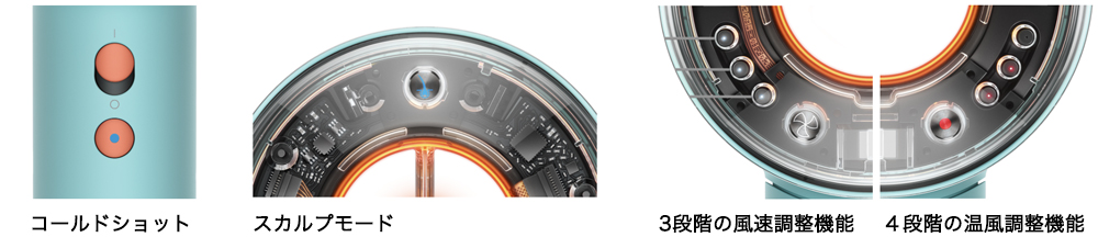 スカルプモードをオンにすると、髪との距離を測定して風温を自動で調整します。連動して、温度センサーランプが赤、オレンジ、黄で風温の変化をお知らせ。