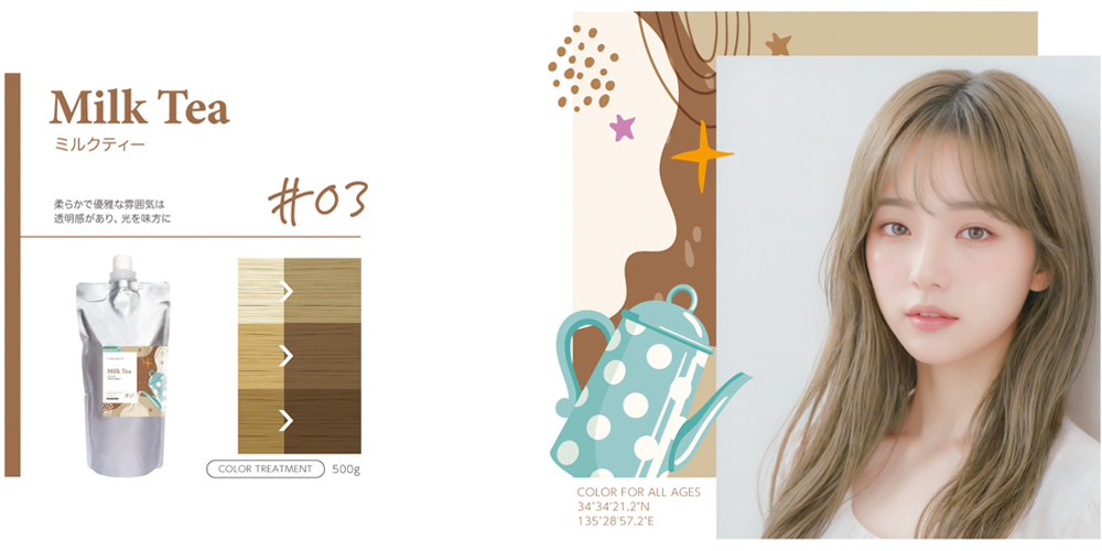 黄くすみを丁寧にコントロールし透明感と奥行きを生み出すことで、あらゆる髪を均一に美しく仕上げます。
