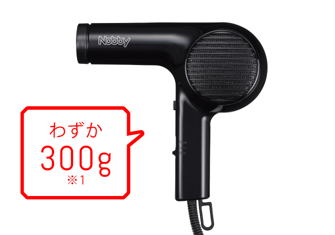 ![]() | わずか300g※1の軽量モデル モーターを含めた製品全体の設計・デザインを見直し、本体重量わずか300g※1の軽量化を実現。 ヘアドライ時の負荷軽減を図ります。 ※1 フード、コードを含まない重さ |
