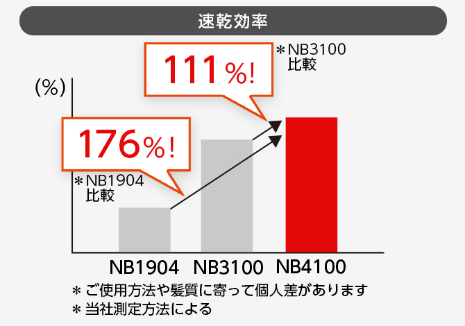 | 《NB4100》 Nobby史上最速乾ドライヤーで、サロンワークを徹底サポート。 ・マイナスイオンユニット搭載 ・マイナスイオン:放出イオン量約1,000万個/cm3以上※当社測定法/当社比較法による | |