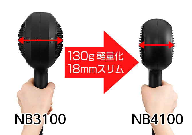 ![]() | スリムなデザイン&軽量化 従来のDCモーターより小型化されたブラシレスDCモーター搭載により、従来機種(※)と比べ製品の奥行が18mmスリムになり、更に130g軽量化。 操作がしやすく、疲れにくいためサロンワークの負担を軽減します。 ※ NB3100 |