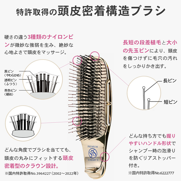 572個の先玉ピンと段差植毛、頭皮密着設計で毛穴の汚れを除去。